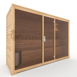 Это специально оборудованная готовая деревянная кабина для сухого и влажного парения. Электропечь нагревает пространство внутри и позволяет сбрызгивать камни водой, слегка увлажняя воздух. Такая процедура позволяет избежать перегрева. Сауна обшита снаружи и внутри кедровой вагонкой и имеет теплоизоляционный слой. Финская сауна с электропечью подойдет, как для домашнего использования, так и для коммерции. Доставляется в разборном виде щитами, собирается по инструкции с помощью шуруповёрта.